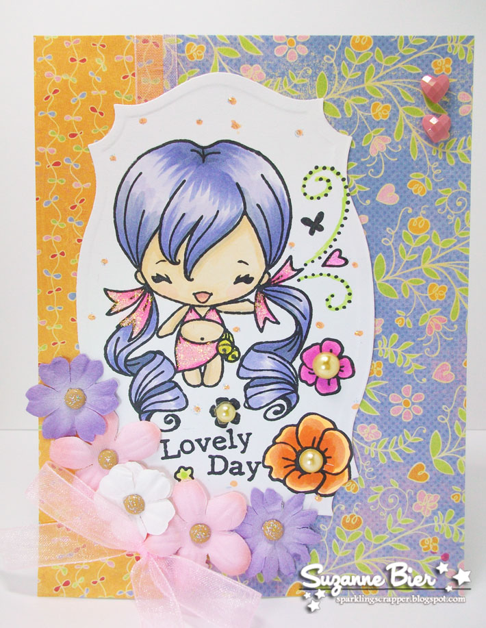 | TGF stamp: “Winky Bean“; paper (“Sugar Rush” 6×6 pad), glitter brads, flowers, sheer ribbon, assorted Copic markers, adhesive gems/pearls, Stickles, Spellbinders Labels 25 die. |
