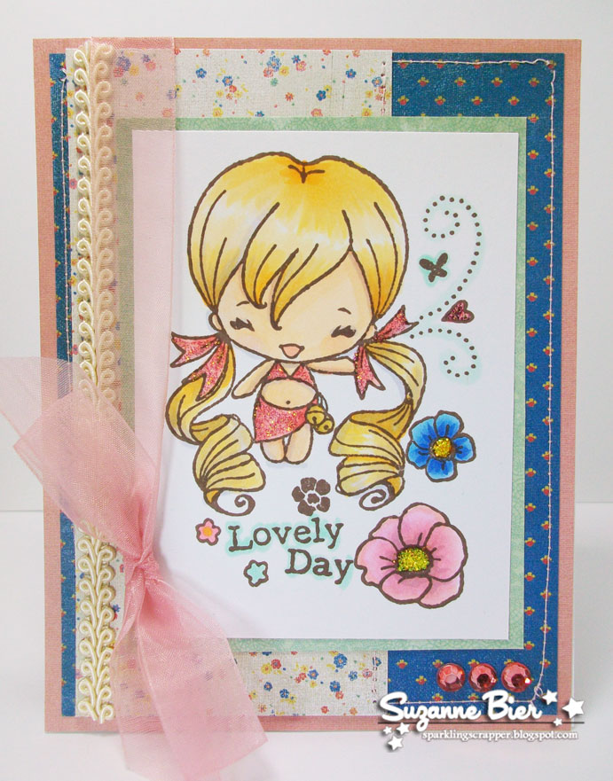 I’m featuring “Winky Bean” on my card, and added the girly elements of pink, glitter, pink glitter, pink ribbon, some fancy trim, flowery prints and sewing! Oh, and I threw some rhinestones in there, too!