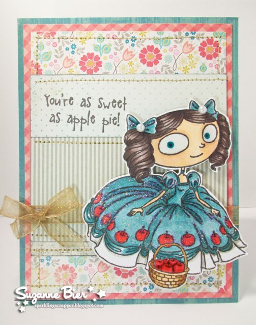 I chose “Abigail Apple” (retired stamp) for my card. I loved coloring up her beautiful puffy dress and all of its pleats and layers! I added some sparkle to her dress with some Stickles.