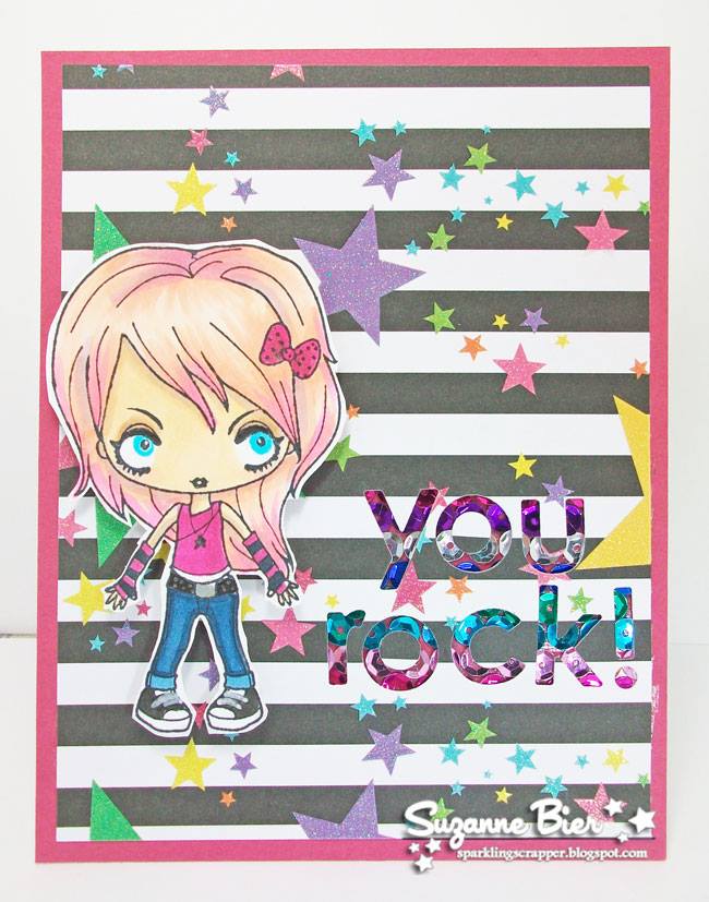 I chose Creeper Crew Abbey for today’s card, and colored her hair in shades of peach and hot pink: