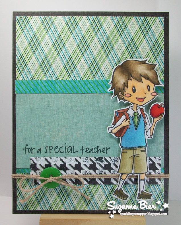 I double embossed a strip of black cardstock to create the houndstooth accent on my card, which features “Backpack Oliver“: