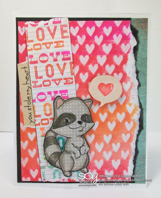 My card features a custom background made with the mini hearts included in the set, and I used the Love x3 sentiment to make some customized patterned paper. And, I couldn’t resist including a cute raccoon and a sentiment from the “Love Bandit” set: