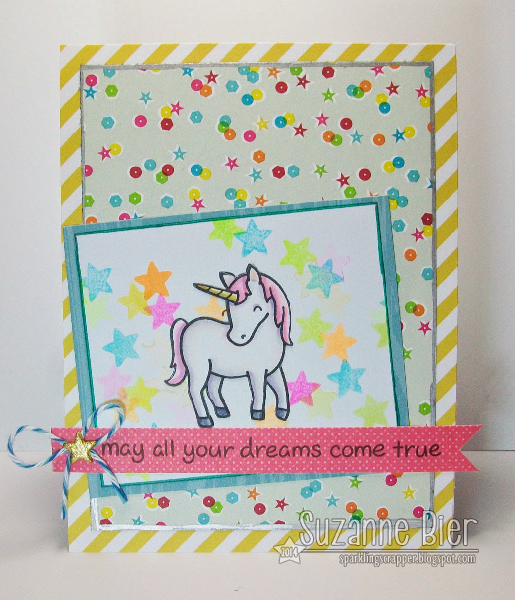 My card features the unicorn and a sentiment from Lawn Fawn’s “Critters Ever After” set, and I used the solid star stamp from the “Summertime Charm” set to create the bokeh effect.