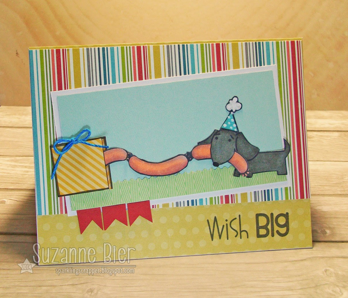 The sketch for this challenge is perfect for building a scene. For some reason, the image of a dachshund pulling links of sausage out of a birthday present got stuck in my head, so I put that scene together on this card!