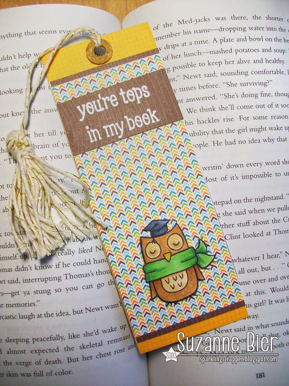 I used papers from the “Into the Woods” 6×6 Petite Paper Pad, the “Winter Owl” stamp, the small graduation cap from the “So Much To Say” set, and the sentiment comes from the “Science of Love” stamp set. I made my own cork reinforcement and tassel to finish off the bookmark.