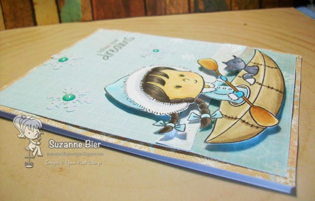 I created a little scene on my card. To make the water, I used Glossy Accents over the patterned paper. I cut an arch of white card stock and added glitter glue to create the snow.