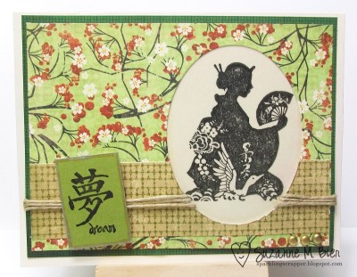I edged the main panel with a gold paint marker, then added solid red twine and an Asian coin charm to the card front. I’ve had a few of the coin charms for years, and I think it was a great choice as an accent on this card.