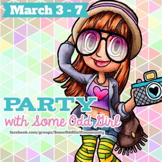 I found that I didn’t have a bunch of Lawn Fawn‘s flower stamps in my collection, so I used the little cherry blossoms from the “Let’s Roll” set and the branch from the “Winter Sparrows” set to make a cherry tree with blossoms. The skunk is from a retired, limited-edition Lawn Fawn set.