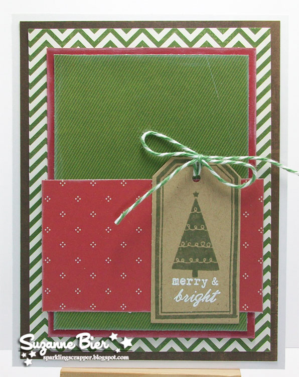 | Supplies: patterned paper [“Very Merry Christmas” mini pad – Echo park; “Wonderland” mini pad – Studio Calico (red pattern)], sentiment stamp, tag die, tag stamp (“Fillable Frames 9” – PaperTrey Ink), tree stamp (My Mind’s Eye), twine (“Holly” – Trendy Twine/Annie’s Paper Boutique), ink (“Olive Grove” Memento – Tsukineko; VersaMark), white embossing powder, kraft cardstock. |