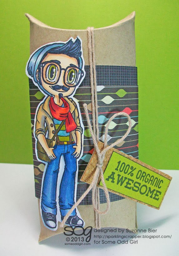 | SOG supplies: “Hipster Kody” clear stamp set; Other supplies: designer paper (Basic Grey “Hipster” mini pad), solid kraft twine (Trendy Twine/Annie’s Paper Boutique), Pillow Box punch board (We R Memory Keepers), kraft cardstock (PaperTrey Ink), cork sheet, assorted Copic markers, Memento Ink in Espresso Truffle. |