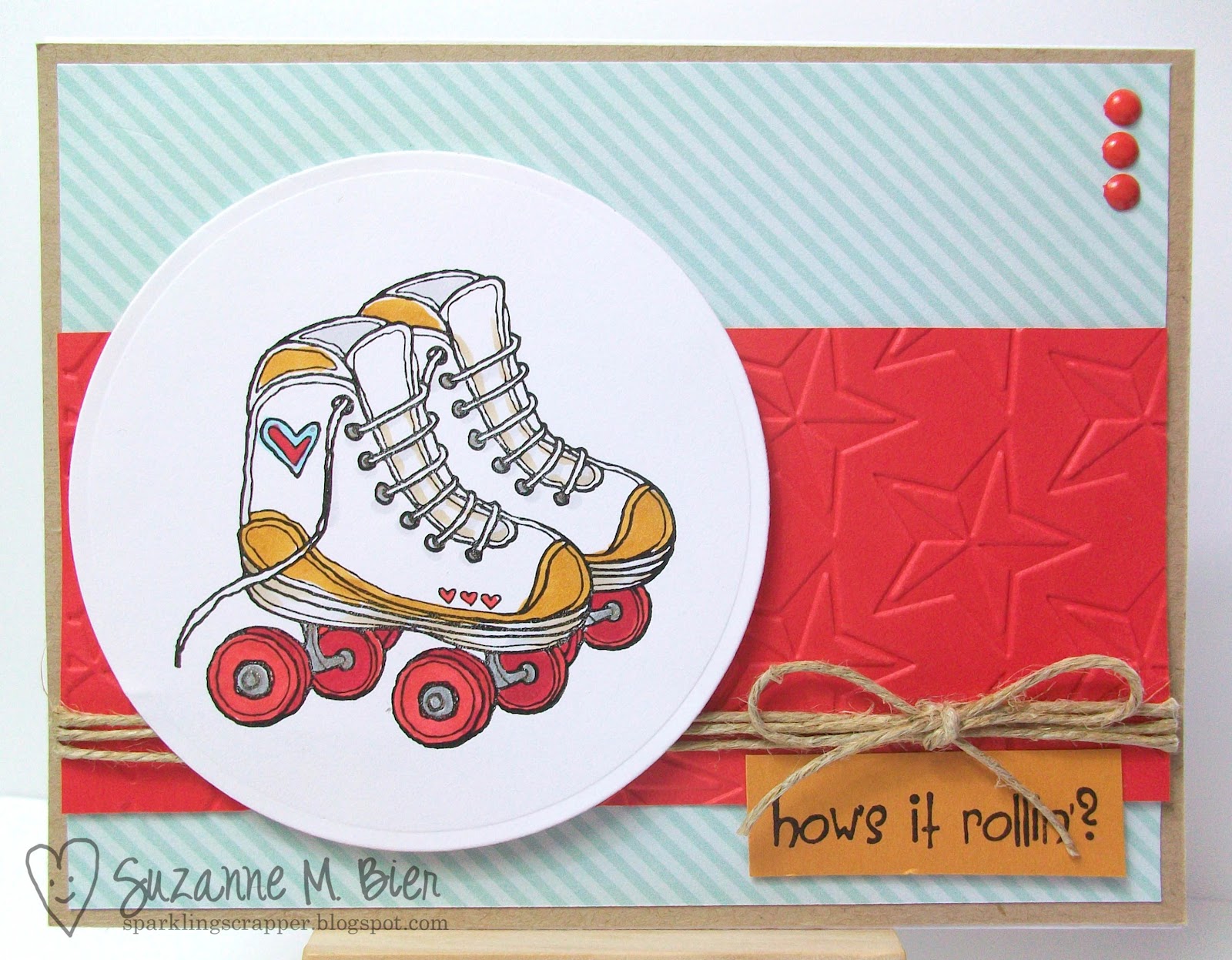 | Supplies: kraft and white cardstock (PaperTrey Ink), red and yellow cardstock (Poppy Parade, More Mustard – Stampin’ UP!), striped patterned paper (Echo Park), image and sentiment stamps (Unity Stamp Company – “Hows It Rollin'” Itty Bitty set), mini brads (Basic Grey), jute twine, Brilliance Graphite Black ink, silver gel pen, Copic markers, foam tape, embossing folder (Cuttlebug). |