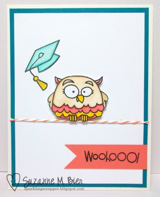 | Supplies: card base, colored card stock (Cameo Coral, Island Indigo – Stampin’ UP!), owl & sentiment stamps (Chubby Chums – Paper Smooches), graduation cap stamp (Hats Off to You – Lawn Fawn), twine (Whisker Graphics), foam squares, Copic markers (owl – E30, E31, Y17, Y19, R22, R24; graduation cap – B00, B01, Y17.) |