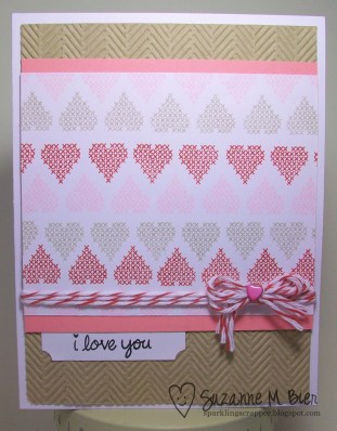 Here’s my card! (I’ll admit, it took a few tries to get the rows of hearts the way I wanted them to be!) The pink ink came out a little lighter than I expected…it was the closest pink that I had to Regal Rose, so I added the strips of Regal Rose at the top and bottom of the stamped part to make sure I worked that color in. I’m a fan of sweater-y patterns, and I love how this card came together!