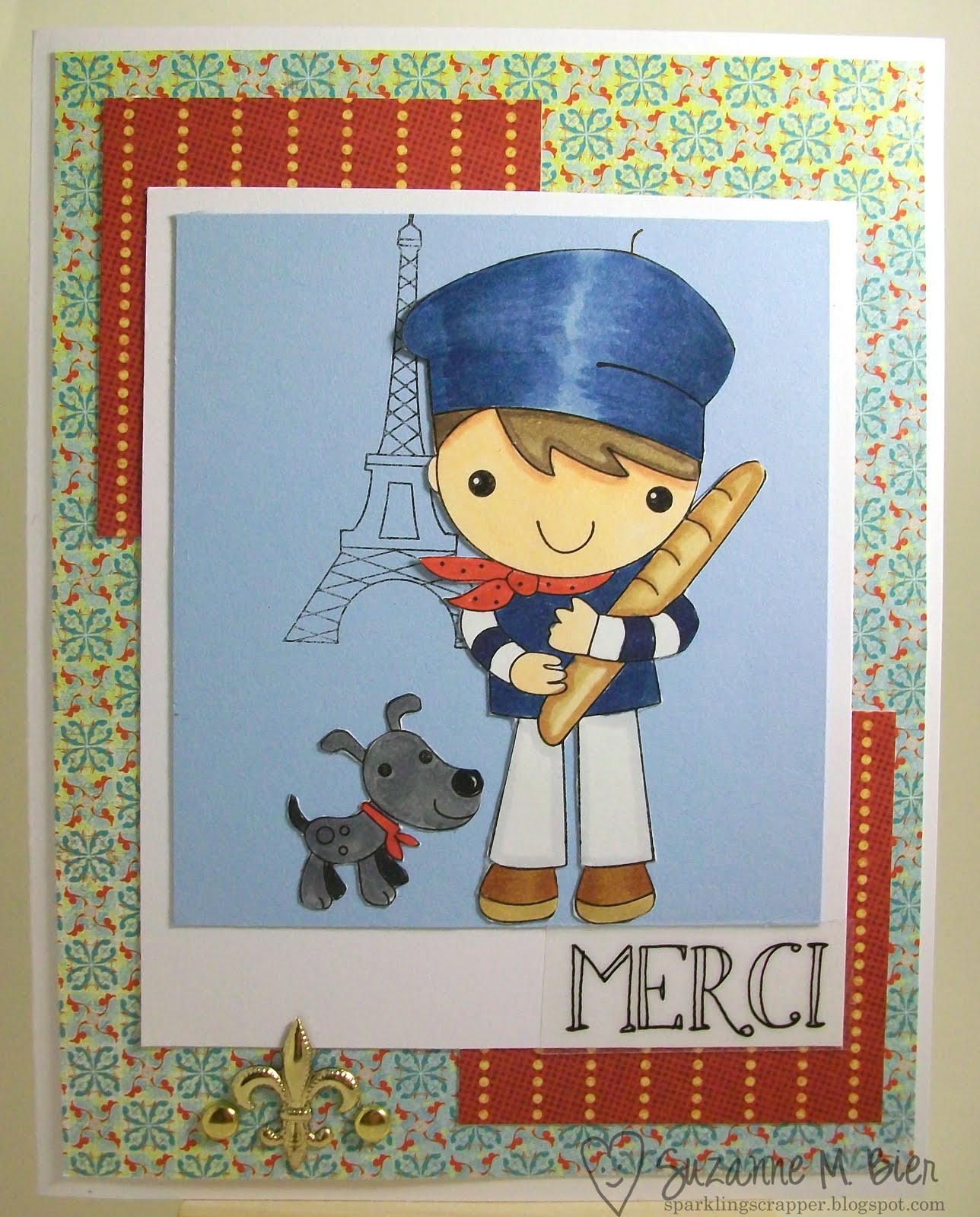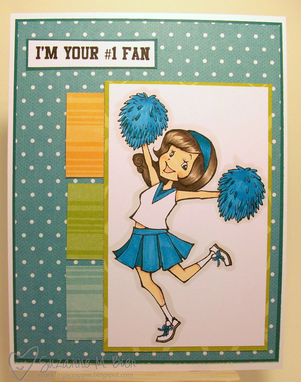 Other supplies: pink striped paper (Echo Park Dots & Stripes), glitter brads, cardstock (Bazzill), card base, Copic markers.