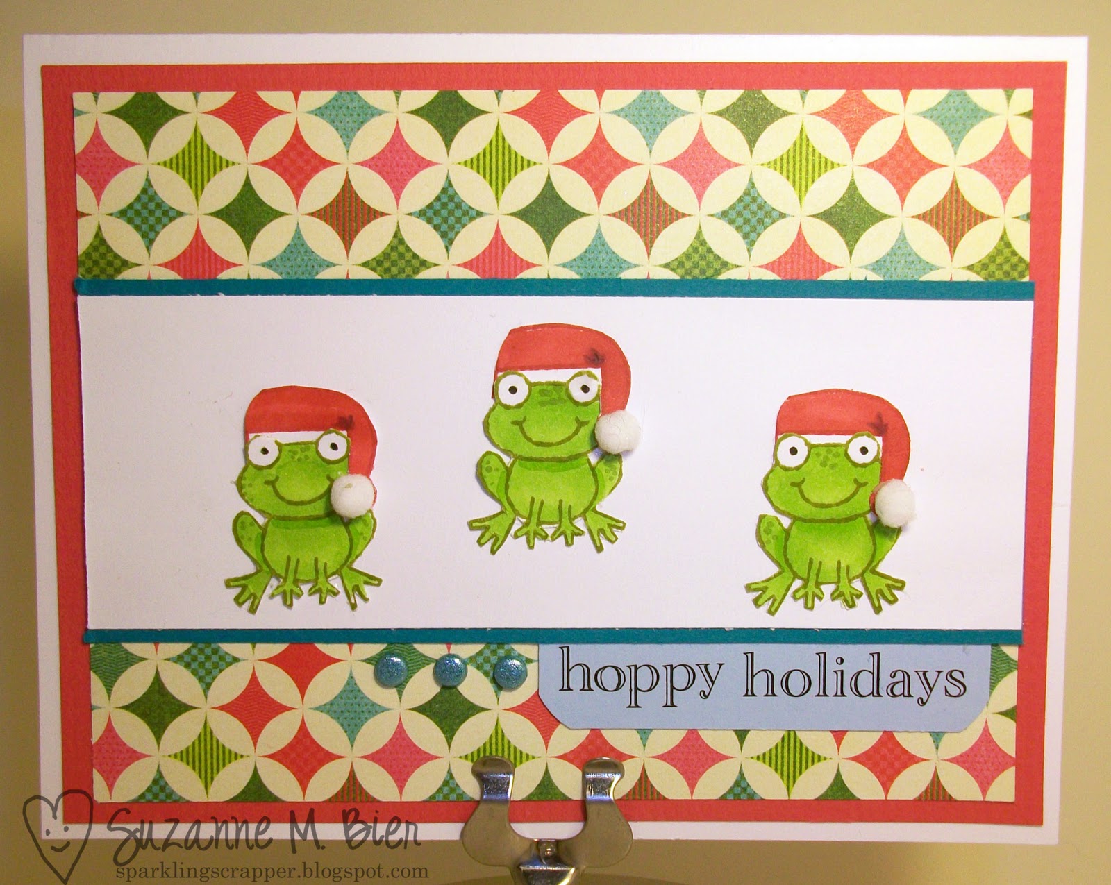 | Supplies: card base, image stamps – (Santa hat – Paper Smooches; frog – Stampin’ Up!), ink (Stampin’ Up!) sentiment (Making Memories rub-on), glitter brads, Copic markers, cardstock, (Stampin’ Up! & Bazzill), patterned paper (My Mind’s Eye – 12 Days of Christmas), corner rounder, pom-poms. |
