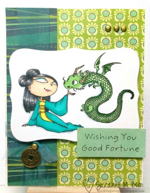 I’ll admit, it’s not one of my favorite colors, but I had fun with this challenge! I asked Scott for some ideas using the color green, and one that he came up with was a dragon. So, I picked one of my Kraftin’ Kimmie stamps that features a dragon, and colored it up!