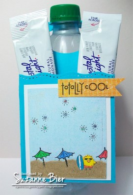 | DeNami stamps used: Surfer Chickie, Umbrella Garnish, Party Time Stamp Set. The sentiment used on this card is from another manufacturer…I stamped it to show placement on this example. (This size could fit four regular bottle drink packets…unfortunately, I didn’t have any of those, so I used the 2-quart size for my example!) |