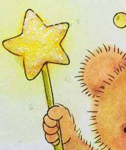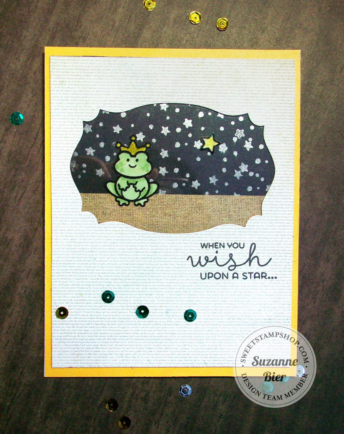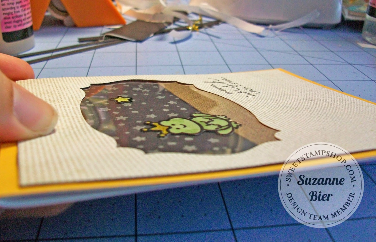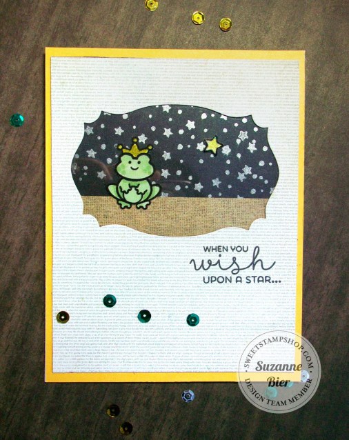 Here’s a closer look at the card front. After I colored the sky, I heat embossed the stars and used a blender pen to push the color around the stars so they each have a glow.