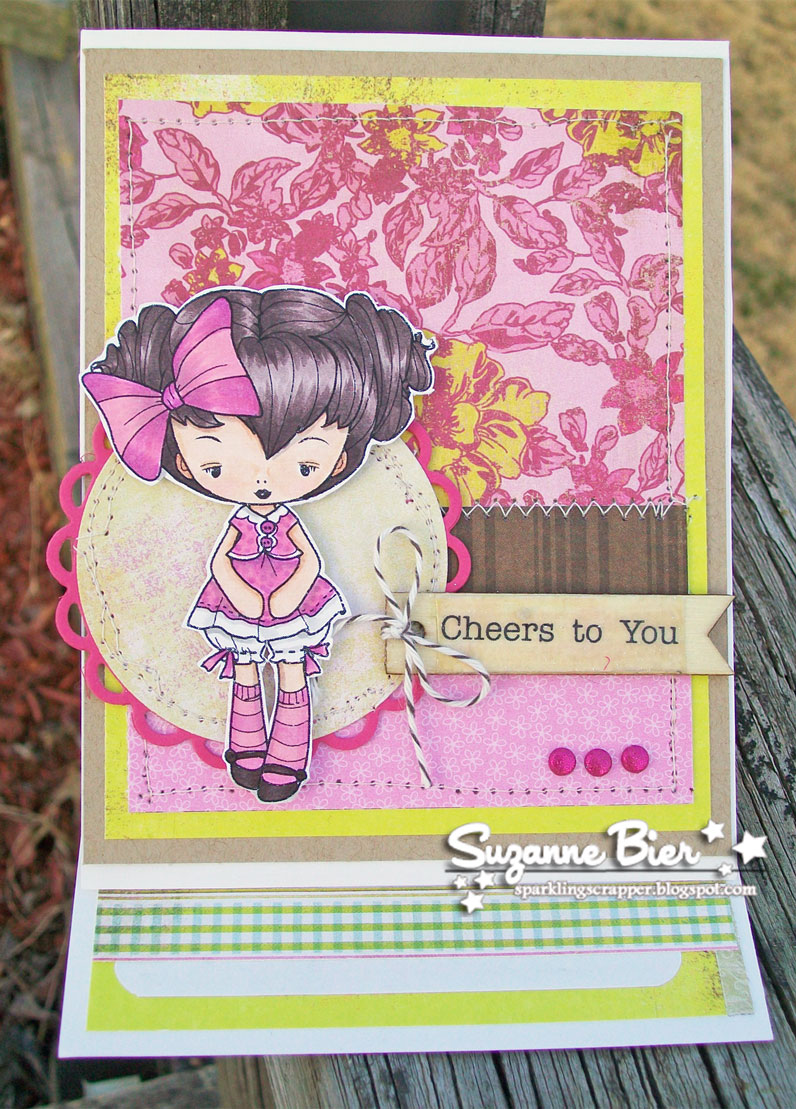| Other supplies: digital stamp (“Wonderland” set – The Greeting Farm), adhesive rhinestones, assorted Copic markers, patterned paper (“A Mother’s Love” mini pad – My Mind’s Eye), twine (Trendy Twine), button, foam tape, sewing machine. |