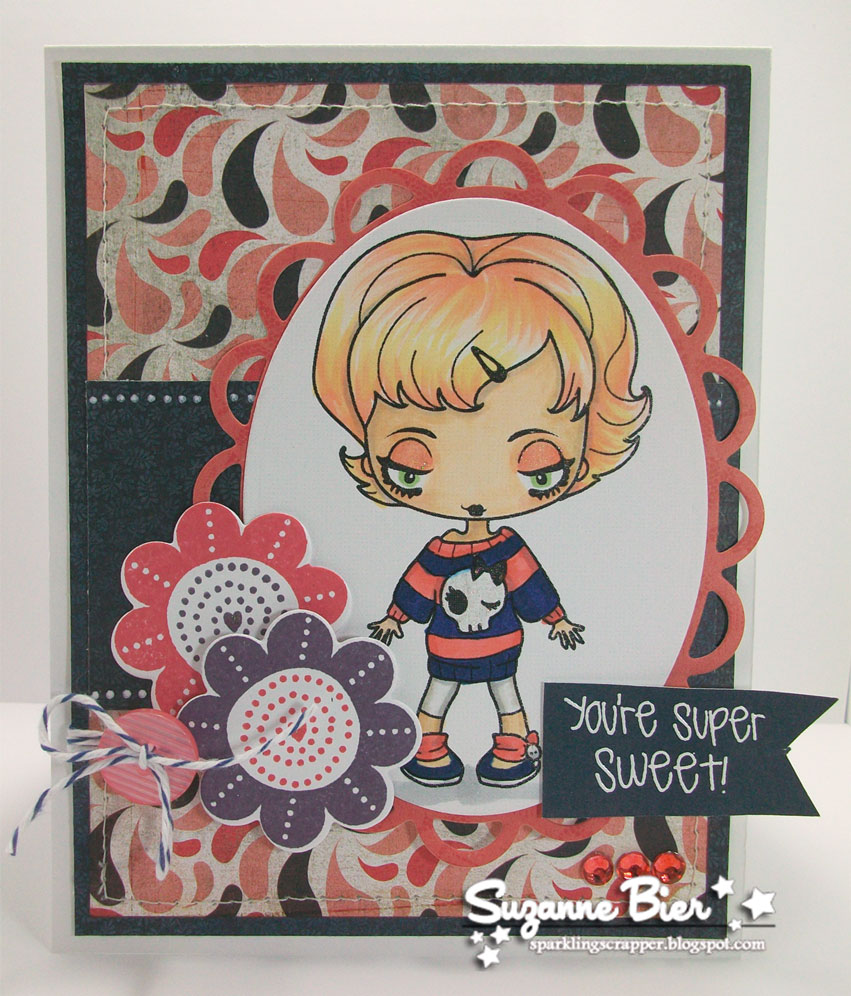 | Supplies: image stamp (“Queen Bean” – The Greeting Farm), patterned papers (Echo Park), Spellbinders Labels 25 die, twine, sewing machine, foam tape, assorted Copic markers, Stickles, coffee filters. |