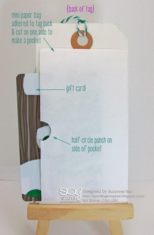 The back of the tag hides a secret compartment that’s perfect for a gift card! I trimmed a mini paper bag to make a pouch for the back of the tag. To make it easier to snag the card, I punched a half circle in the middle of the open end of the pouch before sticking it down.