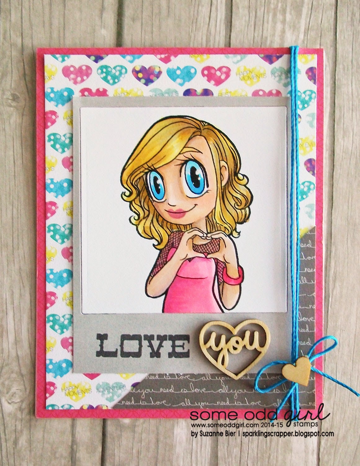 Our challenge for this month is “Splats.” I used a few of my Copic reinkers to make a background and dropped ink in a few different colors on plain white card stock. My main image is the Levana Lover Letter digi, and the sentiment is one of the phrases from the new “Outlined Words With Love” chipboard set!