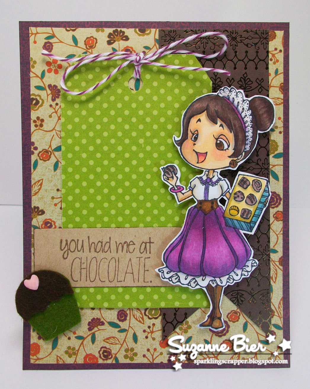 This week, we’re challenging you to use felt on your entry. I made a card featuring “Chocolate Box Ruby” and I used felt from my stash to create a chocolate candy embellishment.