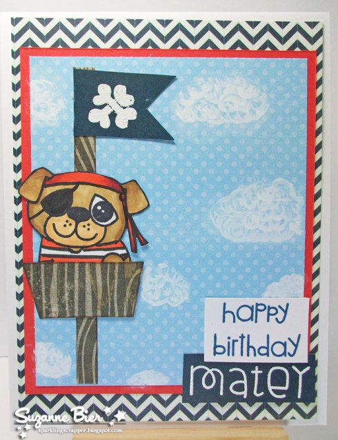 I drew the striped shirt, bandanna and eye patch on the dog to fit the theme. Here’s the challenge photo that inspired this card: