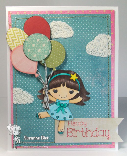 | Supplies: image stamp (“Alice Bean” – The Greeting Farm), patterned paper (“Marjolaine” 6×6 pad – Basic Grey), kraft cardstock, ink (Memento), assorted Copic markers, sewing machine, opaque white marker, Spellbinders Labels 28, twine (Annie’s Paper Boutique). |