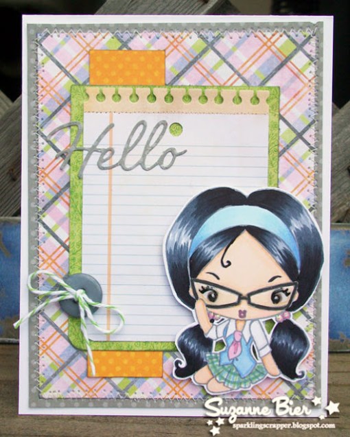 | Other supplies: patterned paper (“Baby Jane” – Cosmo Cricket), Copic markers, twine (“Blue Berry” – Annie’s Paper Boutique/Trendy Twine), silver gel pen, silver glitter brads (American Crafts), sewing machine, Spellbinders Labels 25. |