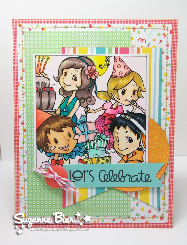 | Image stamps: “Birthday Cake Emily“, “Celebrating Chloe“, “Party Time Oliver” and “Birthday Josh” – Sparkle Creations Rubber Stamps; sentiment stamp from “Birthday Sampler” set – Paper Smooches; assorted Copic markers, Memento Tuxedo Black Ink, button, Strawberry Cupcake Trendy Twine – Annie’s Paper Boutique, sewing machine. |