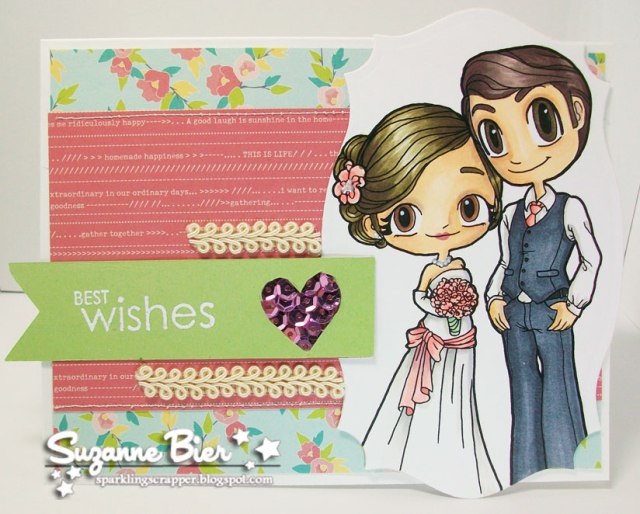 | Supplies: digital stamps (“Bride Mae“, “1920s Kody” – Some Odd Girl), sentiment stamp (aMuse Studio), designer paper (“5th and Frolic” – Dear Lizzy/American Crafts), sequins, assorted Copic markers, Spellbinders Labels 25, watermark ink, white embossing powder, trim, sewing machine. |
