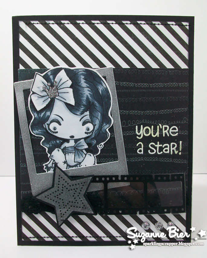 I was inspired by a retro Hollywood theme when I was creating my previews for this release, so for my first card, I’m pairing “Tuesday Premiere” with the Polaroid die and film strip. I also colored her in cool shades of grey to match the black & white papers: