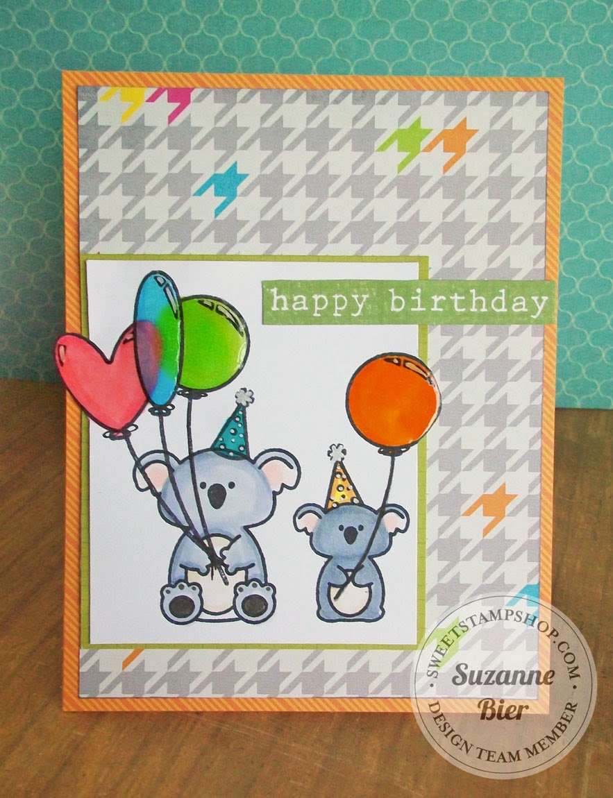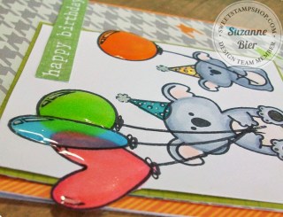 I paired the Koala Family images with the “Balloons” and the party hat stamp from the “Too Hip” set. The sentiment was created with the “Alpha Tabs” alphabet set. Because the koalas are colored grey, I chose to color the balloons brighter so they gave the card pops of color like the background paper has in its design!