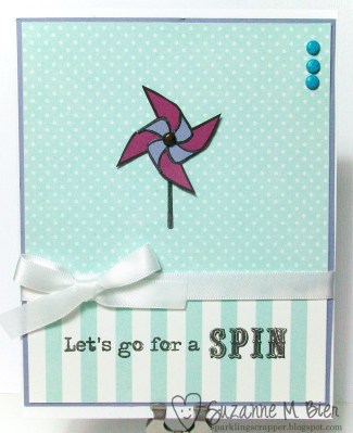 | Supplies: patterned paper (Indie Chic Citron – My Mind’s Eye; Dots & Stripes – Echo Park), ink (SU Soft Suede, VersaMark watermark), stamps (Sew Lovely – The Craft’s Meow), dies (Spellbinders Labels 8, Memory Box Small Pinwheel Posie), white embossing powder, embossing folder (Cuttlebug), sewing machine, buttons, jute twine, mini metal brads, ribbon, foam tape. |