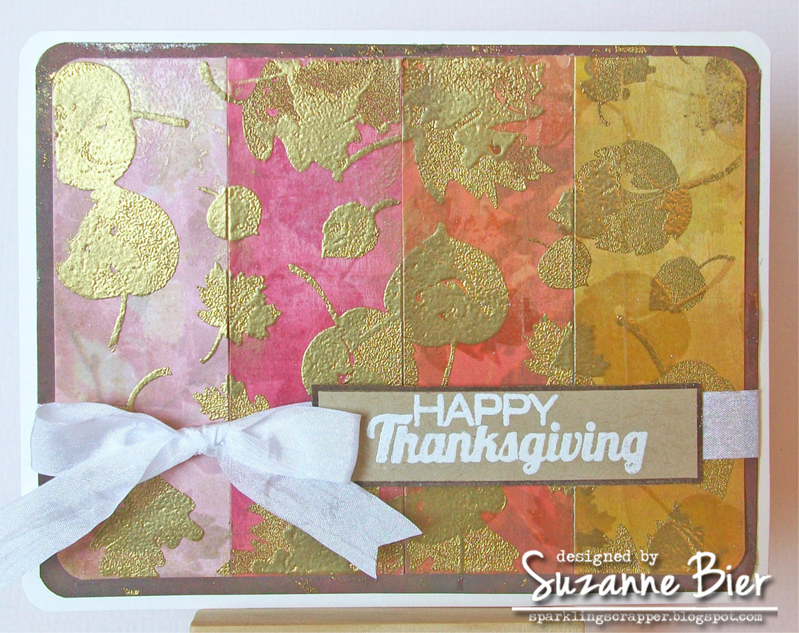 | other supplies: gold, clear and clear embossing powder, watermark ink, designer paper (Basic Grey Indian Summer), clear seam binding ribbon, cardstock. |