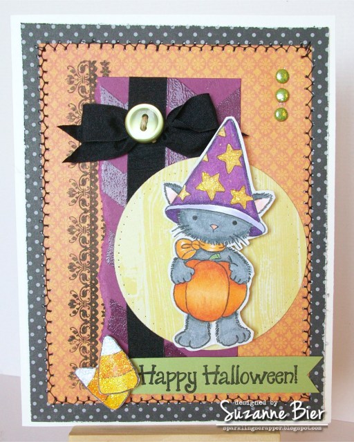 Here’s my card! I combined images from “Good Times” (the embossed chevrons on purple card stock), “Vintage Clocks” (the stamped lacy border on the left), and “Fall with Fibi and Lilly” (the main kitty image, sentiment and candy corn).