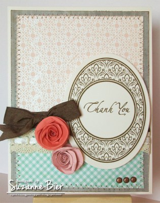 | Other supplies: brown seam binding ribbon, brads, rolled flower die, crocheted lace and ribbon trim, card stock, sewing machine, VersaMark watermark ink, SU! Chocolate Chip ink, card base. |