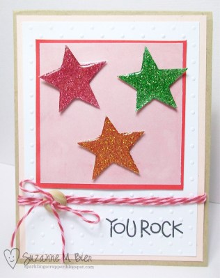I made the star accents by drawing a star on card stock, traced it onto thicker card stock, ran it through my Xyron sticker maker, then added glitter to the sticky side, sealed it with Glossy Accents and let it dry overnight. The green star didn’t come out as “limey” as I would have liked it to be in the picture, but it looks closer to that color in person.